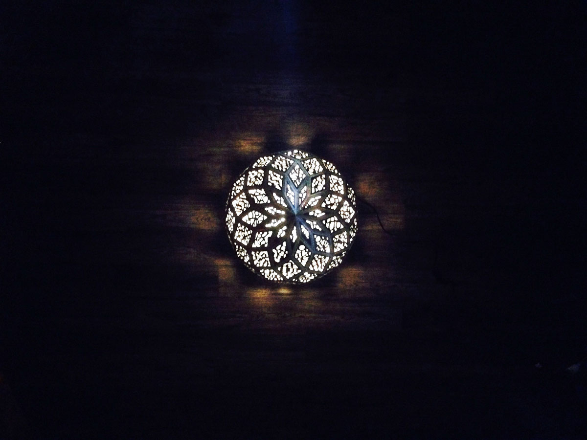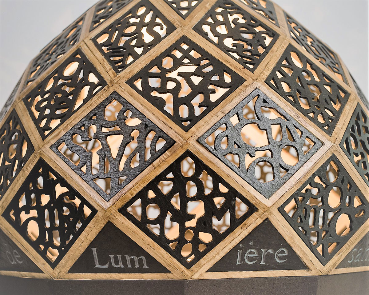 Le Lumizome est ainsi composé de soixante-six losanges et onze triangles, tous évidés, sculptés et gravés. Il mesure 62cm de diamètre et sa hauteur est de 60cm. Le temps de réalisation est difficile à chiffrer précisément, nous l'estimons entre 400 heures et 500 heures de travail.